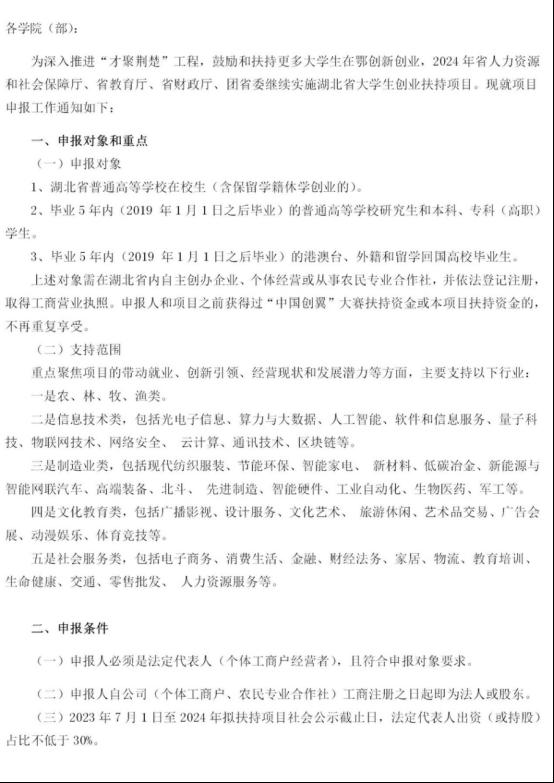 关于开展2025年武汉市大学生创业项目扶持申报工作的通知各学院:为深入贯彻习近平总书记关于就业工作的...
