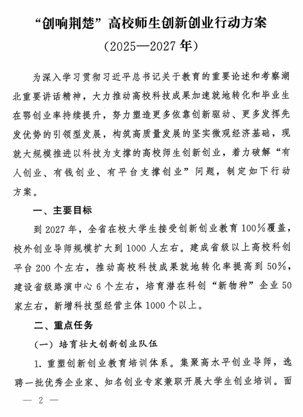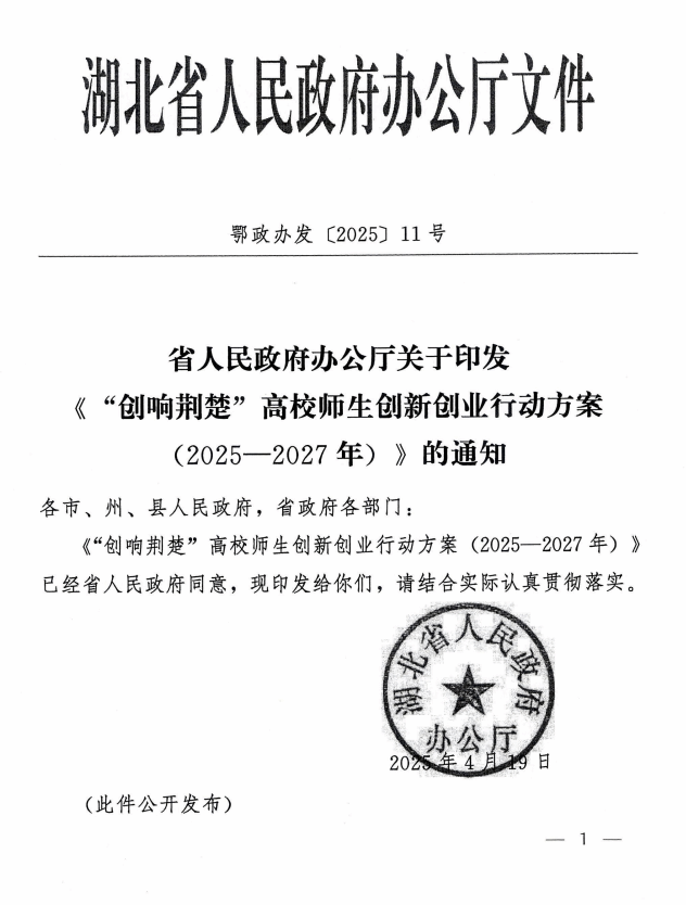 省人民政府办公厅关于印发《“创响荆楚”高校师生创新创业行动方案(2025—2027年)》的通知