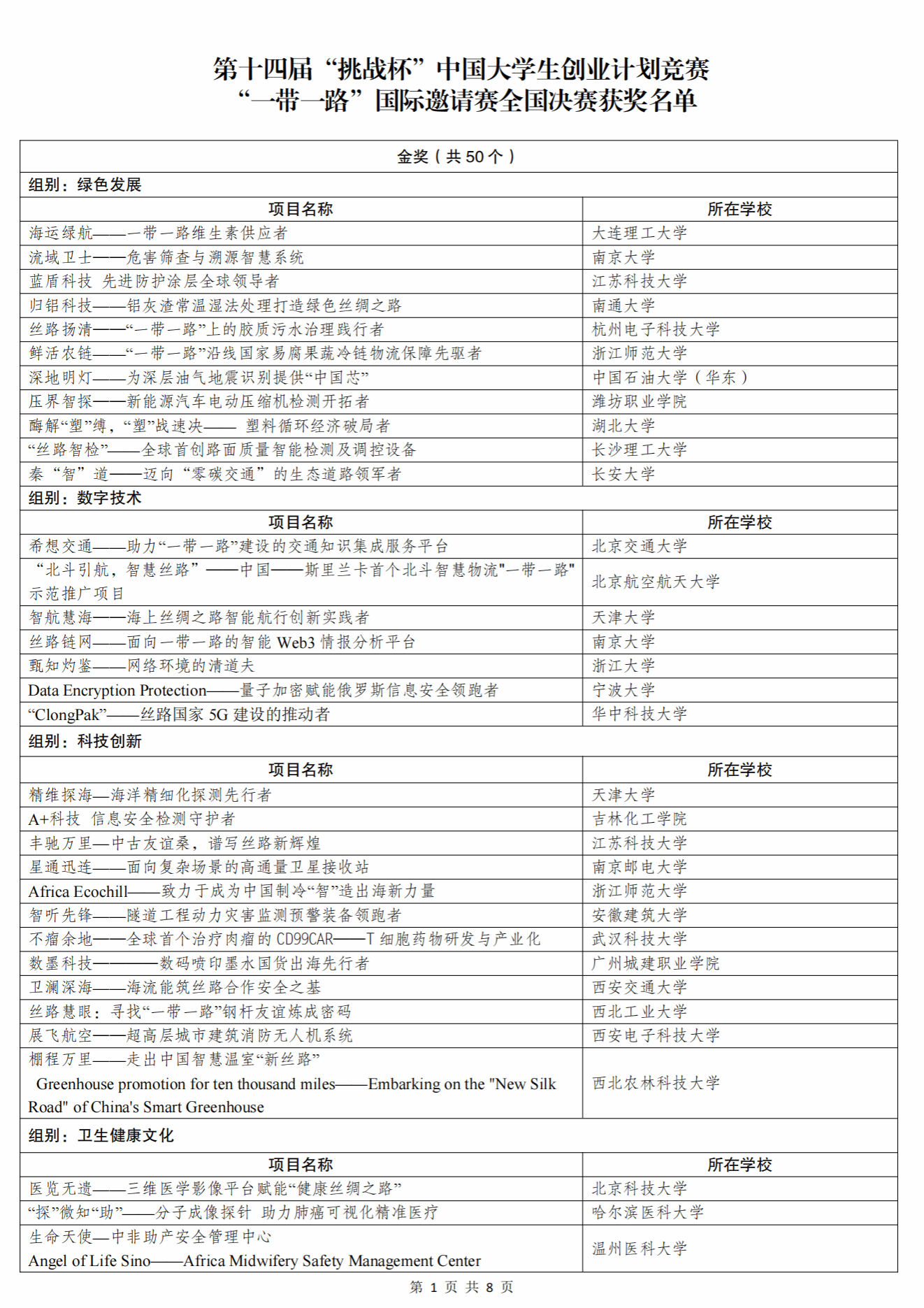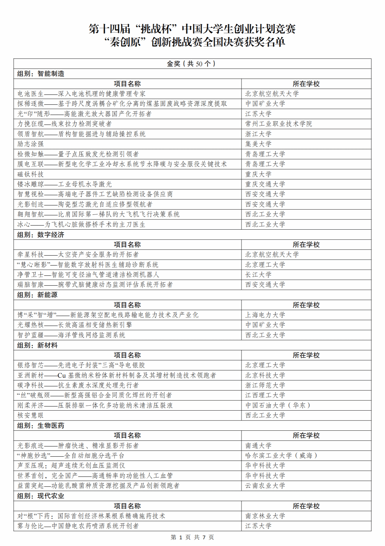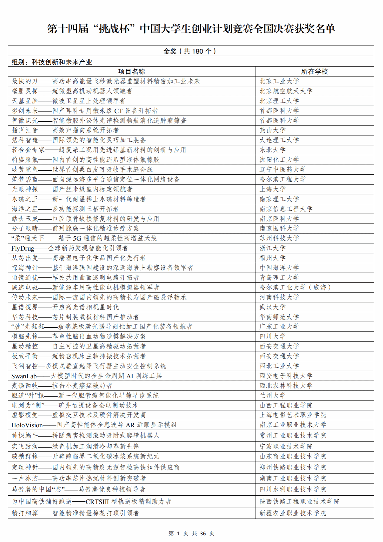 根据《关于举办第十四届“挑战杯”中国大学生创业计划竞赛的通知》和章程有关要求,经过校级初赛、省级复赛、全国决赛初评、全国决赛终评等环节,共评选产生主体赛金奖项目180个、银奖项目356个、铜奖项目1262个,“一带一路”国际邀请赛金奖项目50个、银奖项目99个、铜奖项目151个,“秦创原”创新挑战赛金奖项目50个、银奖项目99个、铜奖项目151个。名单如下(以下排名不分先后)。