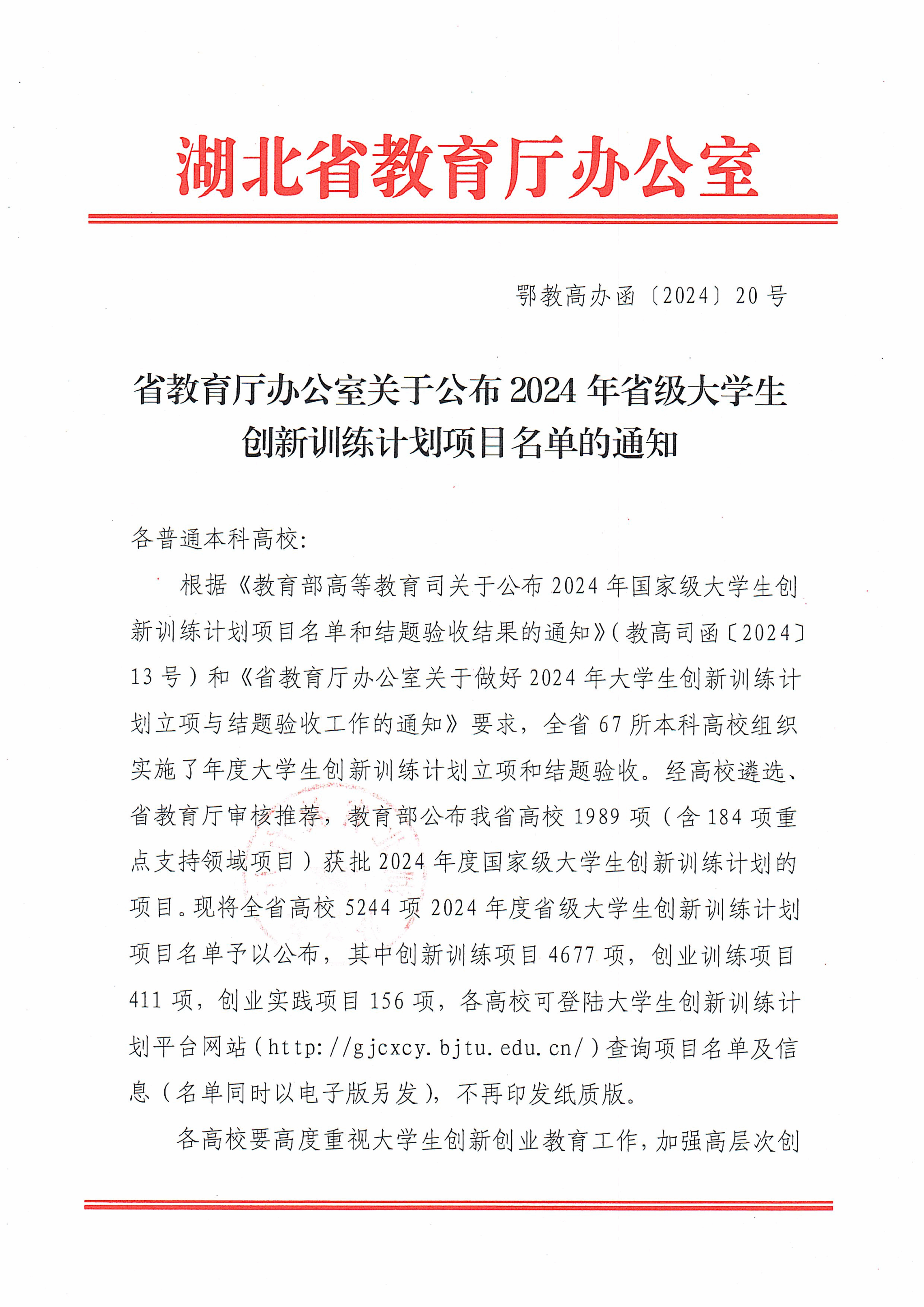 省教育厅办公室关于公布2024年省级大学生创新训练计划项目名单的通知